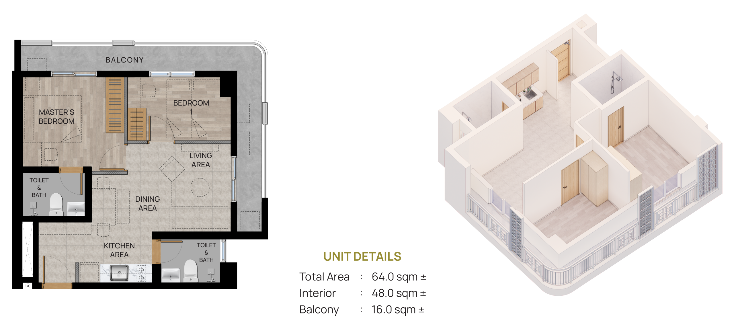 Living Area, Dining Area, Kitchen Area, Master’s Bedroom, Secondary Bedroom, Toilet & Baths, Washer/Dryer Space in Balcony